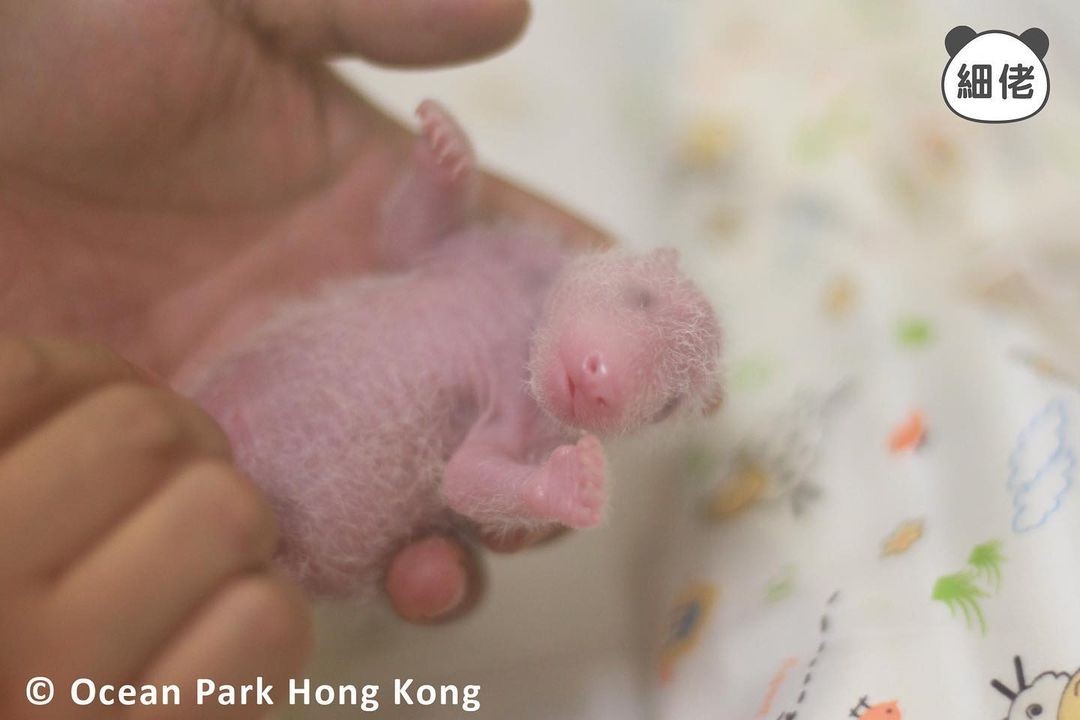 香港新聞網8月23日電 香港海洋公園23日在社交平台發出港產大熊貓寶寶的最新照片。圖中可以見到,大熊貓弟弟躺在護理人員的手心裡,張開雙手,小小的“黑眼圈”已依稀可見。