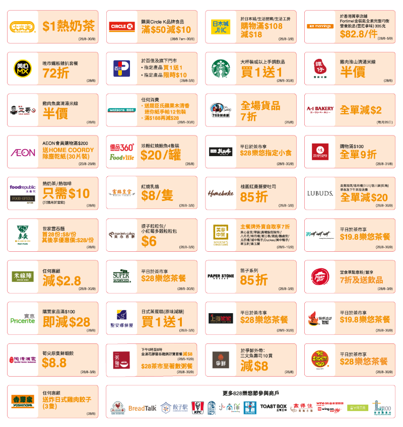 圖源:香港八達通公司 此外,八達通並聯同逾60個商戶,在香港超過3500個消費點推出快閃優惠,例如在一粥麵及上海姥姥,只需28元便可享用“樂悠茶餐”;在實惠購物滿100元減28元;Circle K購買Circle K品牌食品滿50元減10元;日本城購物滿108元減18元;百佳超級市場指定產品買一送一等。