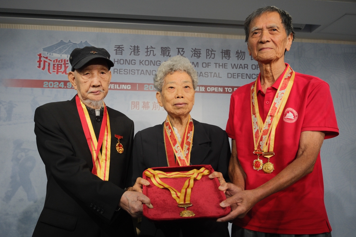 原東江縱隊港九獨立大隊老游擊戰士聯誼會會長林珍(中)等展示“中國人民抗日戰爭勝利70周年”紀念章