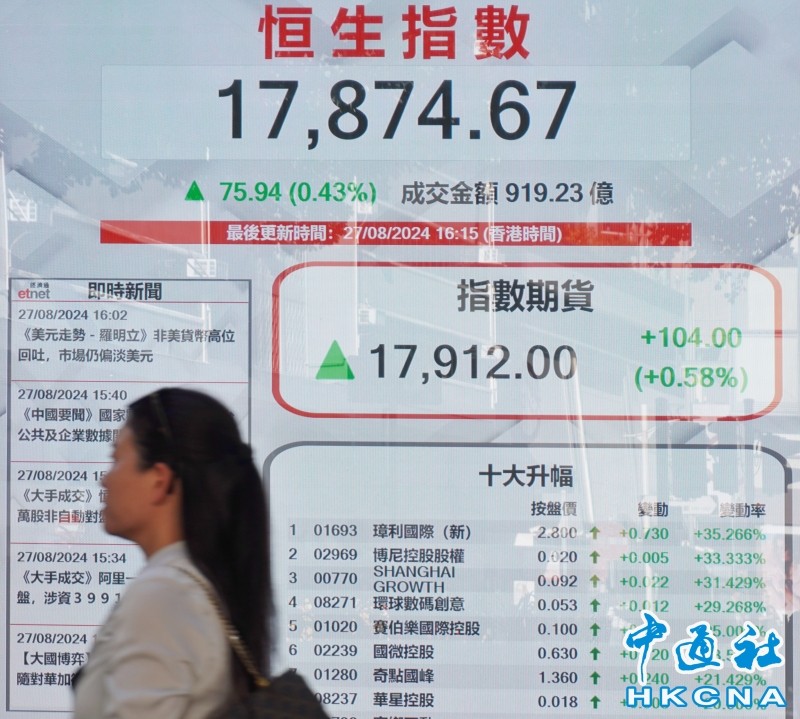 香港中通社8月27日電(記者 張明臻)港股繼續伸延反彈再創月內新高,恒指連升第二日,收報17874點,升75點或0.43%;大市全日成交919億港元。