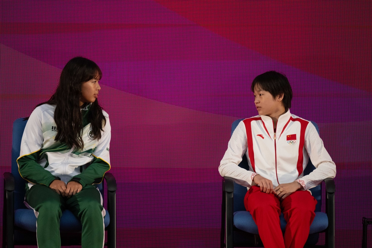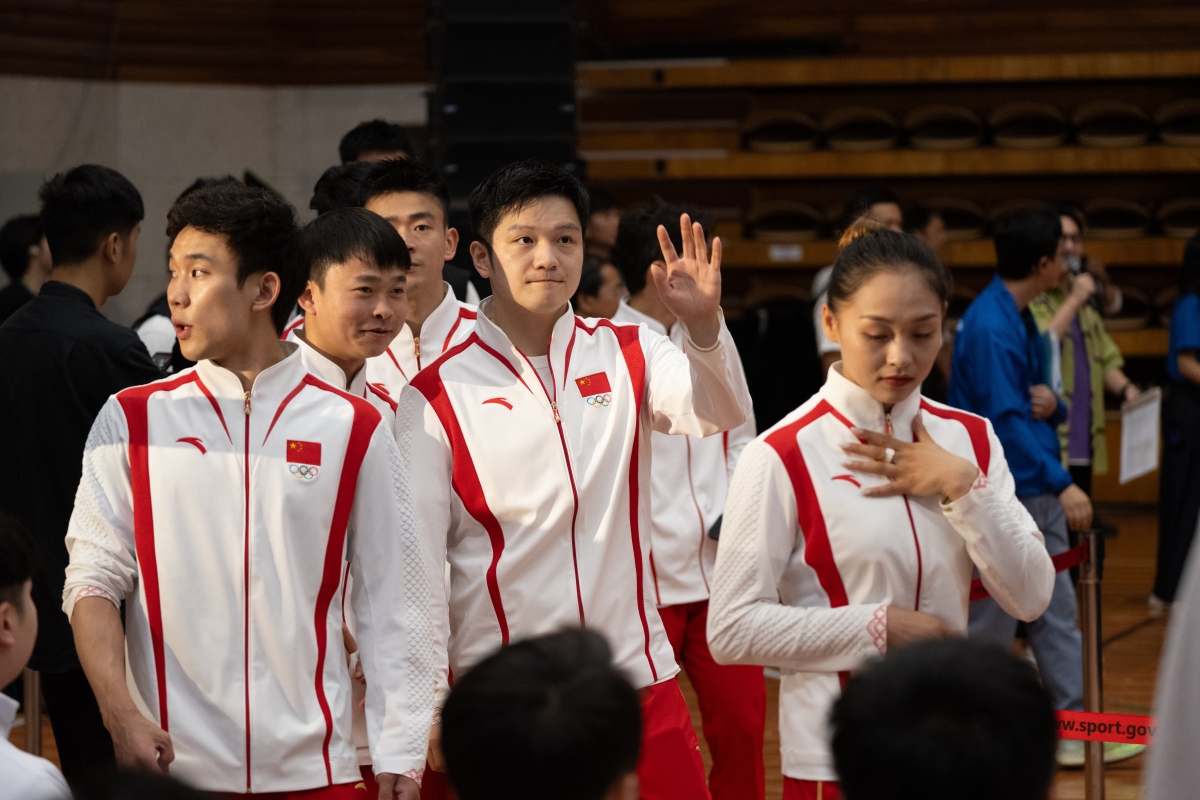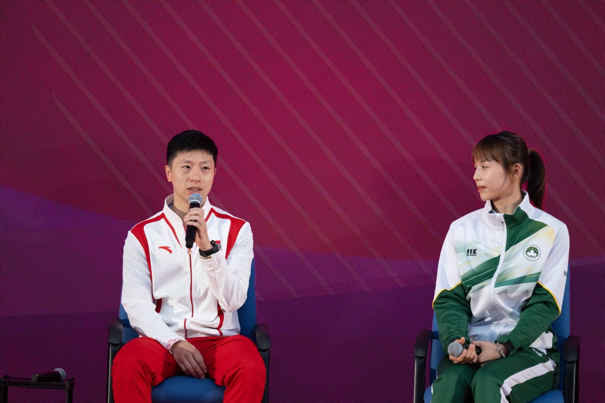 香港新聞網澳門9月1日電 9月1日,國家奧運健兒代表團在澳門展開第二天行程。當天上午,包括全紅嬋、馬龍、潘展樂等金牌選手在奧林匹克體育中心室內體育館出席與澳門青少年運動員真情對話,與 600名澳門少年運動員互動交流,分享運動員生涯心得。期間,奧運健兒與澳門運動員進行打乒乓球及藝術體操互動。