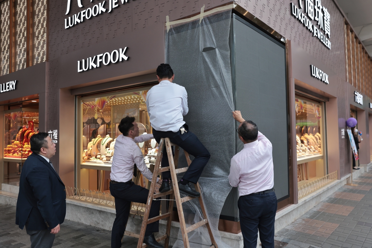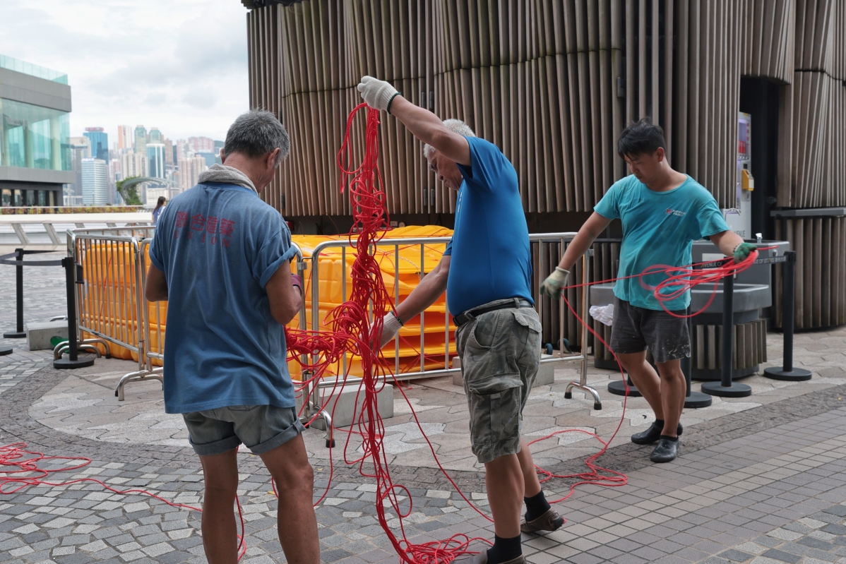 香港新聞網9月5日電(記者  謝光磊 ) 9月5日,香港商戶工作人員正在對玻璃進行保護。天文台當天表示,下午6時20分改發八號烈風或暴風信號。預料與摩羯相關的烈風區在明早仍然會影響珠江口一帶,八號烈風或暴風信號會至少維持至明日正午12時。