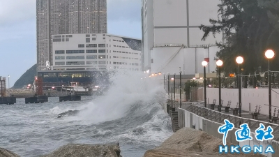 香港新聞網9月5日電 (記者 譚暢)超強颱風“摩羯”迫近,香港天文台傍晚改掛八號風球。有居民到海邊“追風”觀海,港島杏花邨附近,海水已被風力裹挾,湧入街道。  (完)