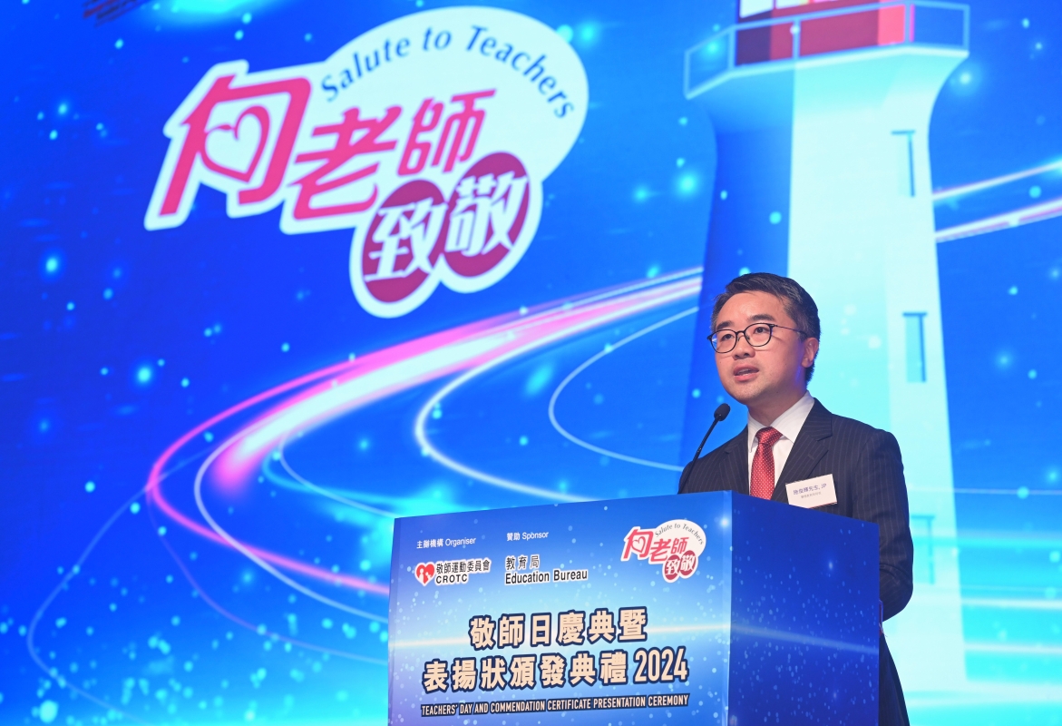 施俊輝。圖源:政府新聞處。 敬師運動委員會主席李少鶴致辭時,感謝教師們每天不辭勞苦地春風化雨,為莘莘學子潤澤灌溉,教導學生修身立德,並向着目標邁進,不斷努力奮鬥,將來貢獻社會。 施俊輝感謝各位老師作育英才,為學生默默耕耘。他表示,香港擁有一支專業優秀的教師隊伍,他們擁有扎實的知識學養、專業的教學技能、還有高尚的品德情操,能以身作則,作學生的楷模。老師們的孜孜不倦、無私付出,值得我們尊敬。 施俊輝指出,專業勤懇的教師團隊是香港教育高質量發展的成功關鍵。教育局將繼續全力支持教師專業發展,為不同專業發展階段的教師提供有系統的培訓,支援老師提升專業素養,以應對不同崗位的職務和挑戰。他深信香港教師團隊會繼續與時並進,堅守“立德樹人”的根本任務,培養學生“厚植家國情懷,錘煉過硬本領”。