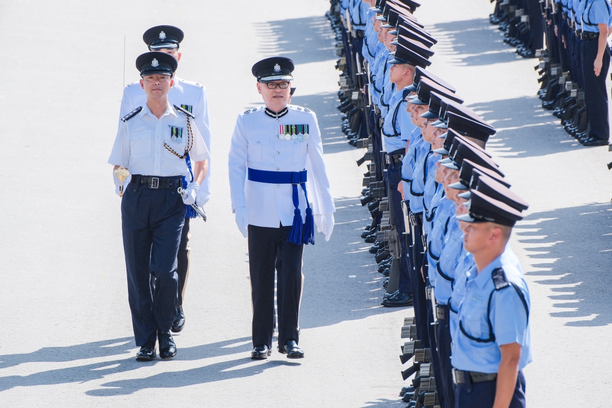 警務處副處長(國家安全)簡啟恩在典禮中檢閱畢業的見習督察和學警。