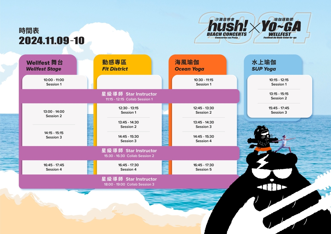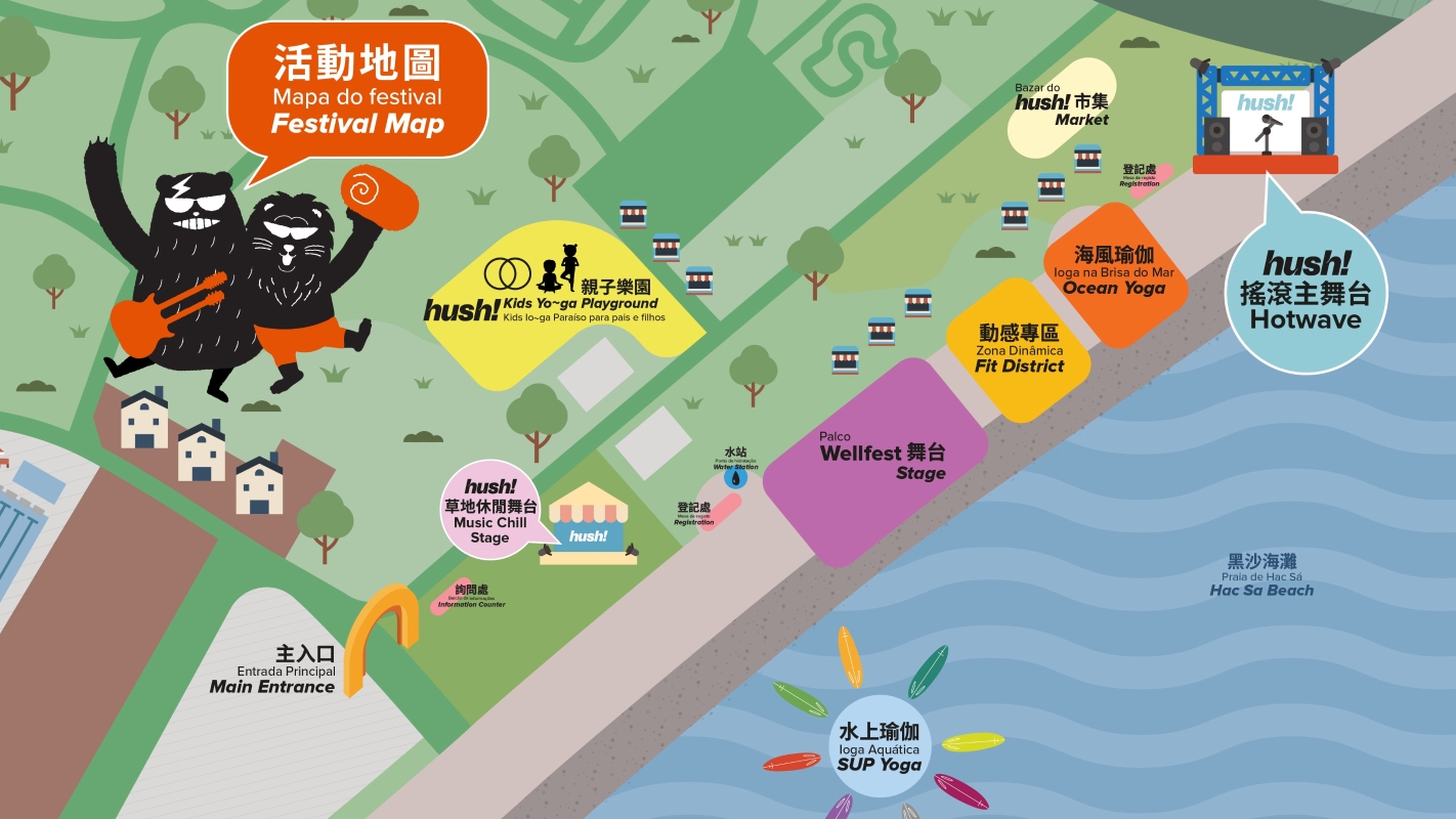 活動地圖。 為了促進社區參與,此次活動還將於11月2日至8日在媽閣塘片區舉行多項延伸活動,項目包括海上遊音樂會、電子音樂派對、戶外瑜伽工作坊等。此外,11月11日將舉辦音樂節創辦人及評審的分享交流會,進一步豐富音樂與瑜伽的體驗。 本次活動的支持機構包括澳門航空、可口可樂及多家銀行等。新聞發佈會於9月17日在美高梅維天閣舉行,澳門特別行政區政府文化局局長梁惠敏等多位官員出席。活動入場免費,瑜伽運動節的門票已於即日起在遨遊Goat手機應用程式及網上開售,票價分為60、240及360澳門元。 “hush! 沙灘音樂會 x Yo~ga 瑜伽運動節2024”預訂及票務詳情 日期:11月9日、11月10日(星期六及星期日) 地點:澳門黑沙海灘及黑沙臨時綠化休憩空間 【編輯:黃璇】