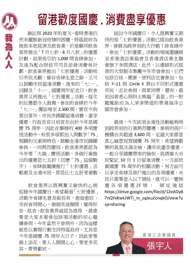 圖源:張宇人fb。 他表示,今年國慶日,令人既興奮又期待的是“七折優惠”活動已經由飲食業界,發展為跨界別的大行動!除食肆外,參加“七折優惠”活動的領域還擴展至香港酒店業協會及香港酒店業主聯會旗下多間酒店。此外,以連鎖形式經營的大型超市集團今年亦會參加,它們包括百佳、惠康、便利店也會參加,包括7–11與 Circle K將以不同形式優惠市民,志在參與,與眾同樂。還有,最近因着悉心照料大熊貓“盈盈”的一對龍鳳胎而為人津津樂道的香港海洋公園亦會參加。 張宇人最後指,今次該項全港性活動能夠得到跨界別的行業熱烈響應,參與的商戶、機構合共超過3600間,足證大家都是真心誠意祝賀國慶75周年,希望將歡樂的氣氛注滿全城,讓市民盡享優惠,一起分享國慶帶來的愉悅。他請廣大市民緊記10月1日留港消費,一方面欣賞國慶 75周年的相關活動,另方面可以享受食肆及商戶推出的各項優惠。 市民遊客點擊網址,即可查看優惠詳情。(完) 【編輯:譚暢】