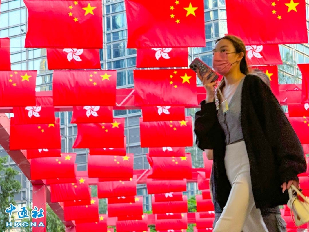 國慶節將至,香港的大街小巷紛紛掛起中華人民共和國國旗、香港特區區旗和廣告標語,放眼望去滿城“中國紅”,處處洋溢著喜慶的氛圍。圖為市民在中環遮打花園的旗海下走過。(香港中通社記者 徐文峰攝)
