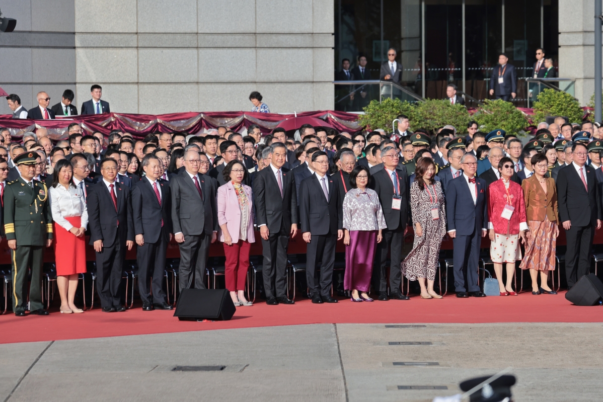 全國政協副主席梁振英、特區行政長官李家超、中央政府駐港聯絡辦主任鄭雁雄,前任行政長官曾蔭權、林鄭月娥,以及特區政府主要官員和社會各界人士出席升旗儀式