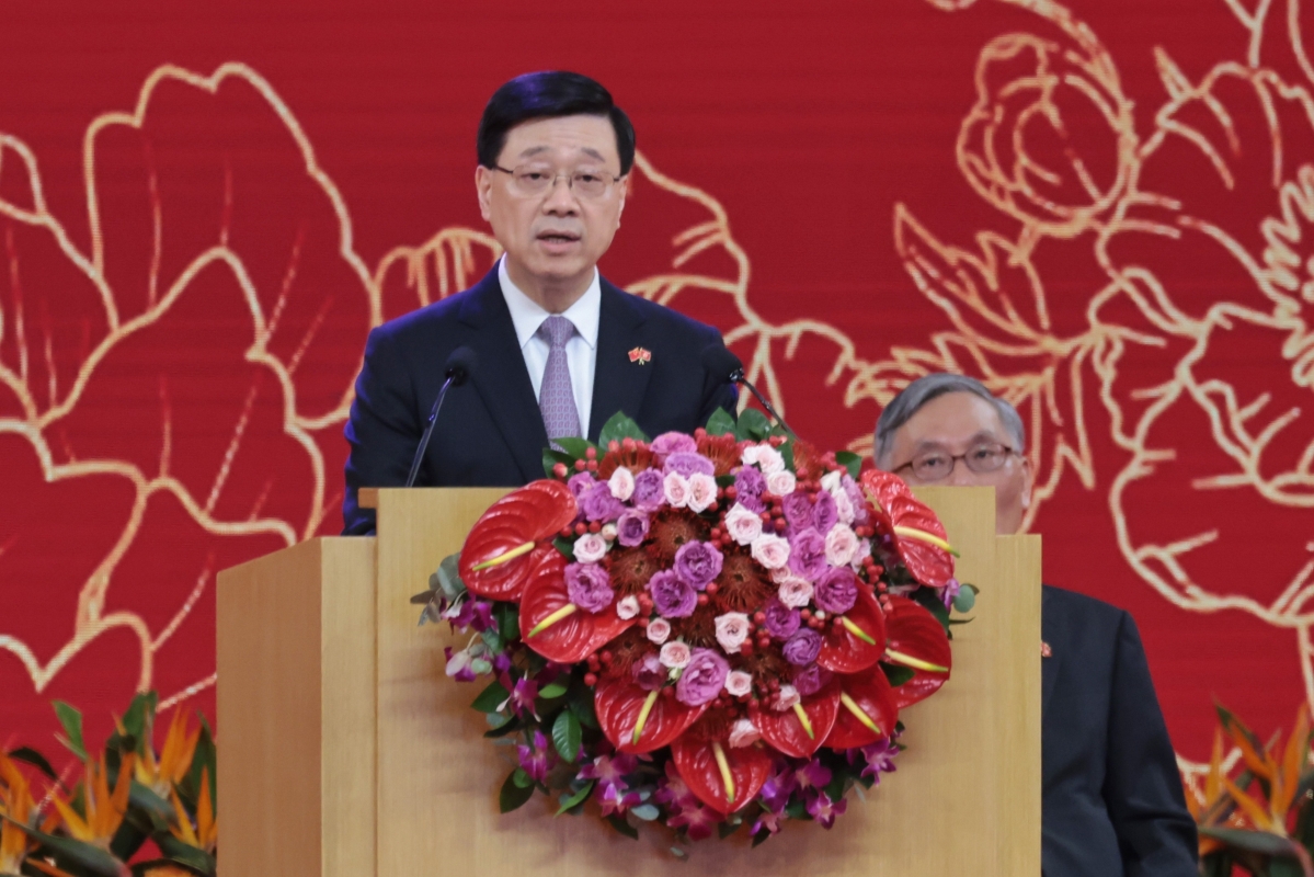 全國政協副主席梁振英(左二)、行政長官李家超(中)、中聯辦主任鄭雁雄(左)等主禮嘉賓出席國慶酒會