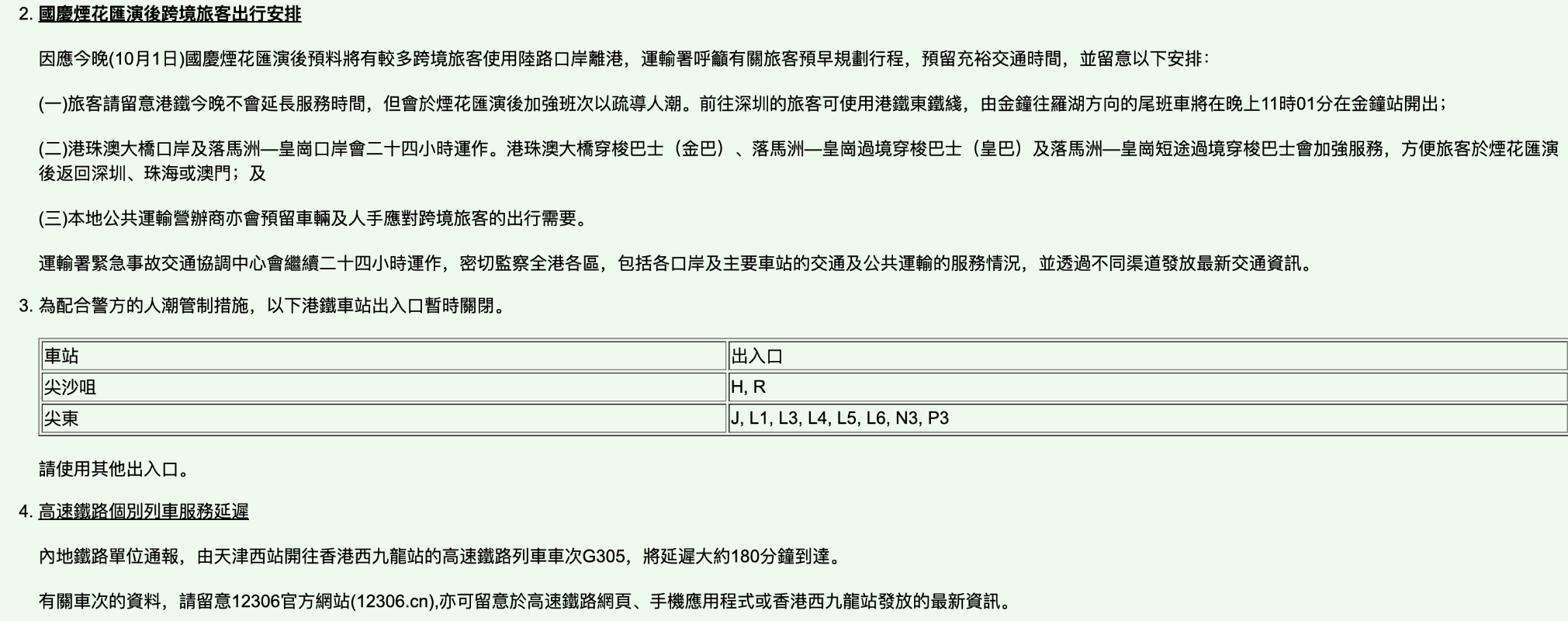 因應國慶煙花匯演後預料將有較多跨境旅客使用陸路口岸離港,運輸署呼籲有關旅客預早規劃行程,預留充裕交通時間,並留意以下安排: (一)旅客請留意港鐵今晚不會延長服務時間,但會於煙花匯演後加強班次以疏導人潮。前往深圳的旅客可使用港鐵東鐵綫,由金鐘往羅湖方向的尾班車將在晚上11時01分在金鐘站開出; (二)港珠澳大橋口岸及落馬洲—皇崗口岸會二十四小時運作。港珠澳大橋穿梭巴士(金巴)、落馬洲—皇崗過境穿梭巴士(皇巴)及落馬洲—皇崗短途過境穿梭巴士會加強服務,方便旅客於煙花匯演後返回深圳、珠海或澳門; (三)本地公共運輸營辦商亦會預留車輛及人手應對跨境旅客的出行需要。(完) 【編輯:陳卓儀】