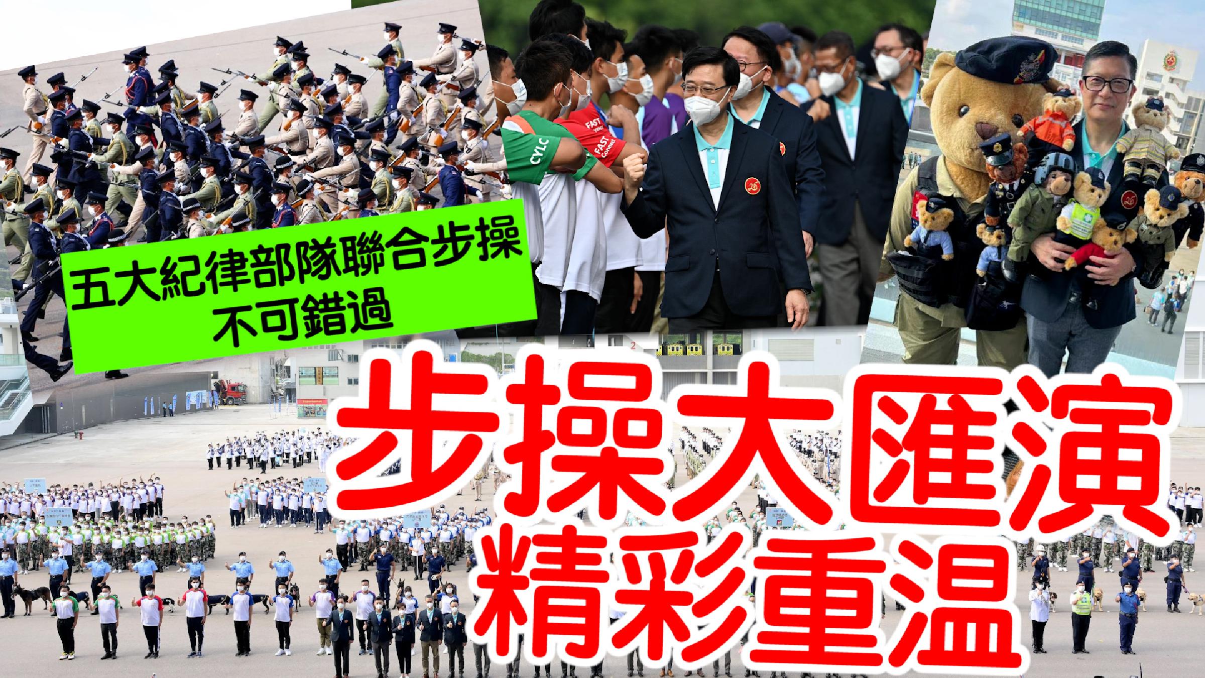 圖源:政府新聞處。 紀律部隊和青少年制服團體大匯演下午舉行。活動先由不同紀律部隊及輔助部隊樂隊的表演拉開序幕。在警察樂隊的演奏下,各部隊和團體的成員以中式步操英姿颯颯進場,消防處護旗方隊繼而進行升旗儀式,現瑒奏唱國歌,政府飛行服務隊直升機在空中敬禮。 主禮嘉賓特區政府政務司司長陳國基檢閱紀律部隊儀仗隊、青少年團體及制服團體。他致辭時指社會各界積極響應政府呼籲,在全港各區舉辦多姿多彩慶祝國慶活動,充分體現大家對祖國的熱愛及未來美好的祝願;而各支紀律部隊及輔助部隊以及青少年團體隊伍的表演,亦展現大家團結一致,維護國家尊嚴的堅定決心,令人鼓舞。他亦勉勵青少年為國家作出貢獻。 接着精彩的表演包括警察樂隊的音樂表演、紀律部隊聯合步操表演、青少年團體表演舞獅舞龍和拳擊、各紀律部隊和輔助部隊不同用途的工作車輛巡遊。為慶祝中華人民共和國成立75周年,警察樂隊安排75名成員參與今日匯操,而步操、音樂及青少年團體表演亦砌出“75”數字以及國旗等圖案。