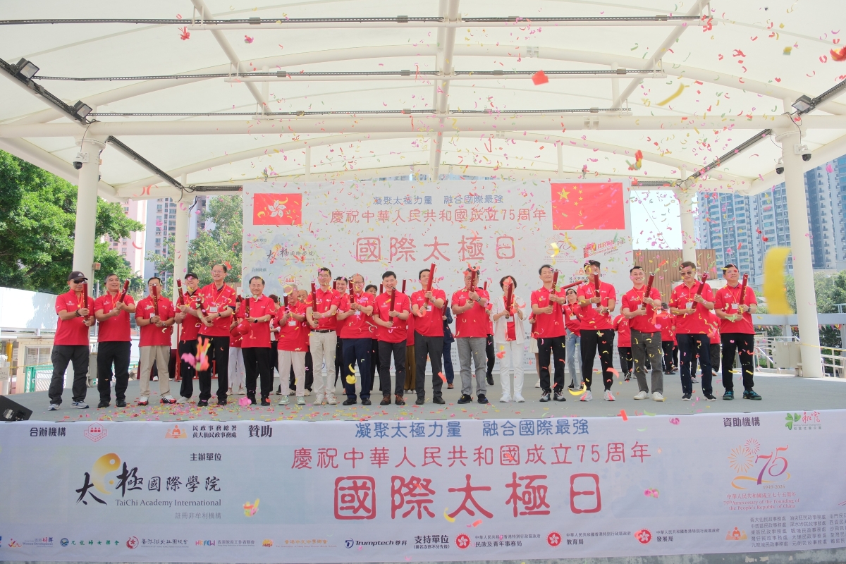 香港新聞網10月12日電 (記者許其皓) 10月12日,香港太極國際學院在黃大仙廣場舉辦國際太極日,並慶祝中華人民共和國成立75周年,眾多太極拳愛好者連同學校師生出席,在香港太極國際學院院長、太極拳大使林文輝帶領下同練習太極操。香港商務及經濟發展局局長丘應樺、香港政制及內地事務局副局長胡健民、香港中聯辦九龍工作部副部長祝小東、國際太極日籌委會主席陳宛婉嫻女士、總監貝鈞奇、會長孫曦、統籌林文輝、劉嘉華等出席開幕儀式。