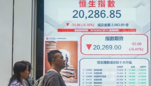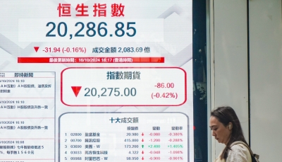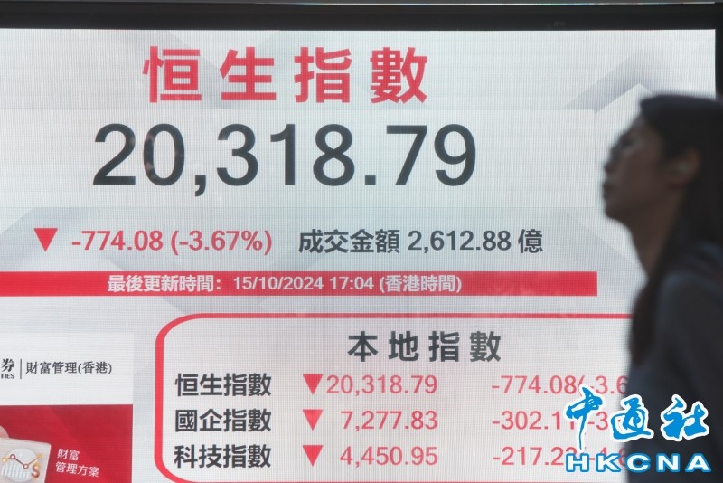 香港中通社10月15日電 (記者 徐嘉儀)美股道指與標指創收市歷史新高,反映中概股表現的金龍指數則滑落2.1%,港股15日急跌,恆生指數收市報20318點,跌774點,失守21000點關口。大市成交額為2612億港元。