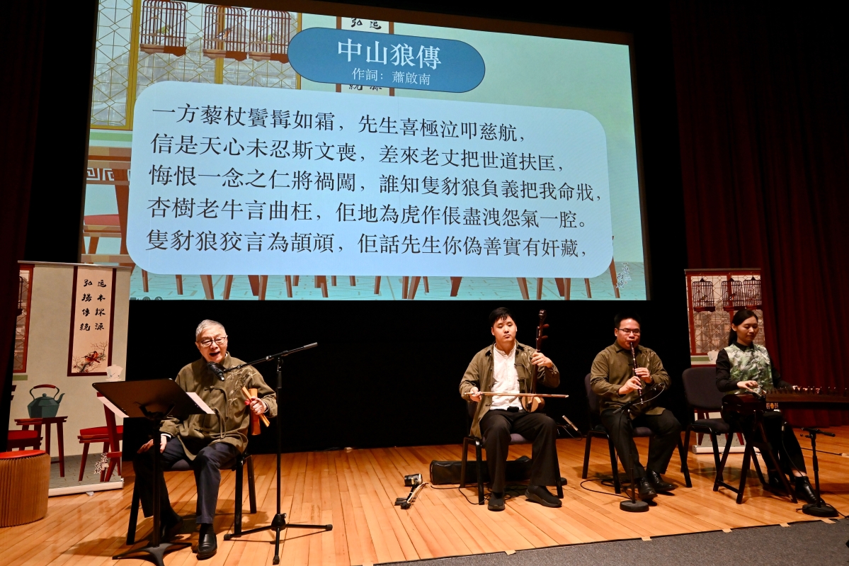 圖源:政府新聞處。 南音是用廣府話說唱的曲藝,是首份“香港非物質文化遺產代表作名錄”的項目之一,現時多融入粵劇、粵曲中,成為其中的演唱元素。是次活動結合演唱、音樂演奏和與觀眾互動等元素,由阮兆輝演唱韻味十足的南音曲目《中山狼傳》,並由香港中文大學中國音樂研究中心執行總監兼洞簫演奏家陳子晉博士、古箏演奏家劉惠欣,及展能胡琴演奏家楊恩華拍和伴奏,介紹嶺南音樂的歷史和特色,同時引導觀眾鑑賞傳統中樂。一桌兩椅創意總監曾慕雪則擔任說書人,以輕鬆活潑的互動講解,帶領觀眾認識南音,同時探究嶺南文化與現代生活的緊密聯繫。音樂會亦加入角色扮演環節及穿插互動問答,拉近觀眾與與藝術家的距離,在輕鬆愉悅的氛圍加深觀眾對嶺南文化的認識。