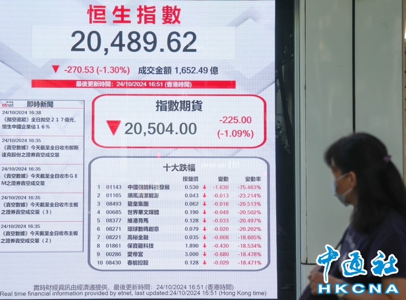 香港中通社10月24日電 (記者 譚暢)受美股23日晚明顯急跌影響,港股24日收市報20489點,跌270點或1.3%。大市全日成交金額約為1652.5億港元。