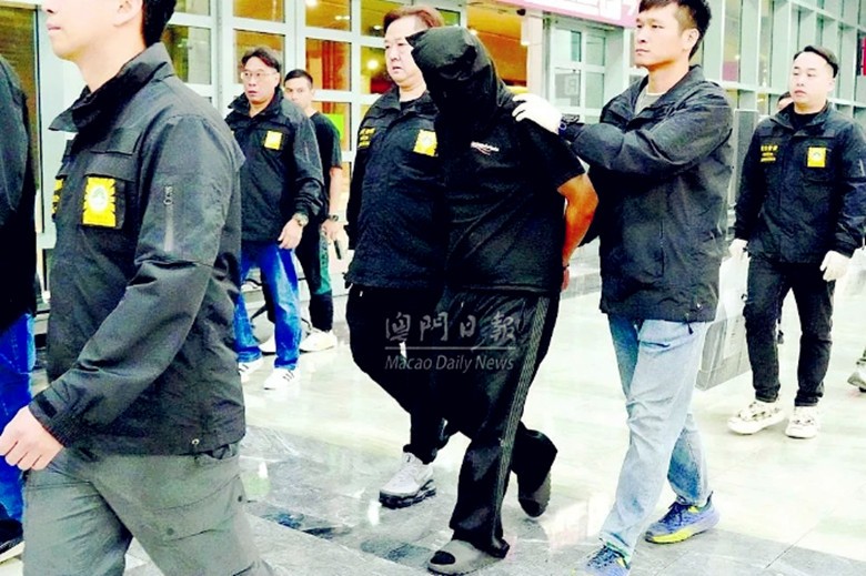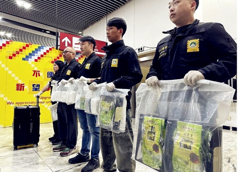 在機場被拘捕的涉案台灣男子。澳門日報圖 報道稱,澳門司警近日接獲情報稱,一販毒集團將安排成員偷運冰毒來澳門。經分析調查,司警部門鎖定10月27日一架由東南亞來澳的航班。 10月27日晚6時15分,嫌疑人黃某從泰國搭乘飛機抵達澳門,手持一大型行李箱入境。因其神色慌張,司警部門確認身份後,立即截停調查。經搜查其行李箱,檢獲一批藏於3個禮盒內、共10包以茶葉包裝作掩飾的冰毒。