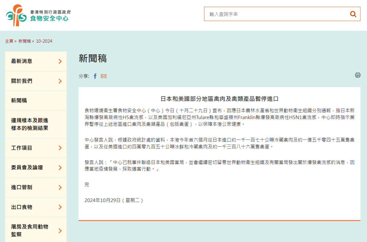 香港食安中心網站截圖 中心發言人表示,根據政府統計處的資料,香港今年首六個月從日本進口約1170公噸冷藏禽肉及約1億5千零45萬隻禽蛋,以及從美國進口約40950公噸冰鮮和冷藏禽肉及約1386萬隻禽蛋。 發言人說:“中心已就事件聯絡日本和美國當局,並會繼續密切留意世界動物衞生組織及有關當局發出關於爆發禽流感的消息,因應當地疫情發展,採取適當行動。”(完) 【編輯:李雪萍】
