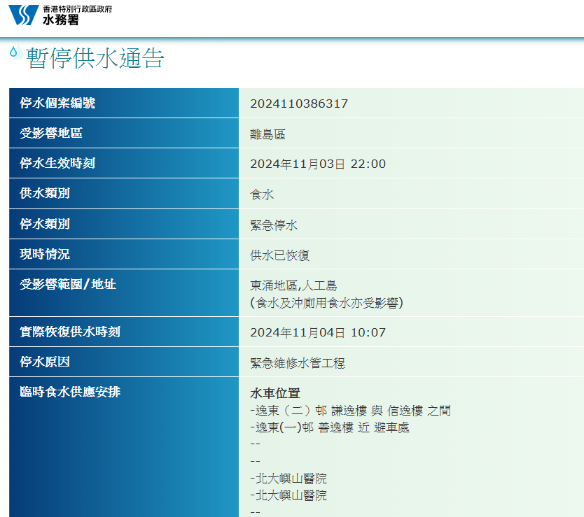 香港東涌市一帶食水供應於10時7分恢復分享到: