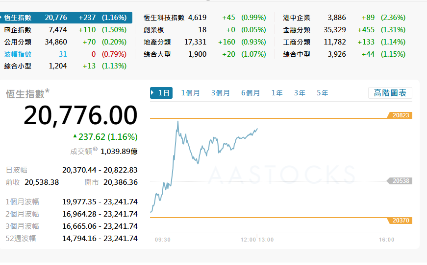 香港新聞網11月7日電  7日,港股兩大指數低開高走,港股早市上升。恒指低開152點後向上,半日升237點或1.2%,報20776點;國指升110點或1.5%,報7474點;恒生科技指數升45點或1%,報4619點。大市半日成交總額約1039.9億港元。  (完)