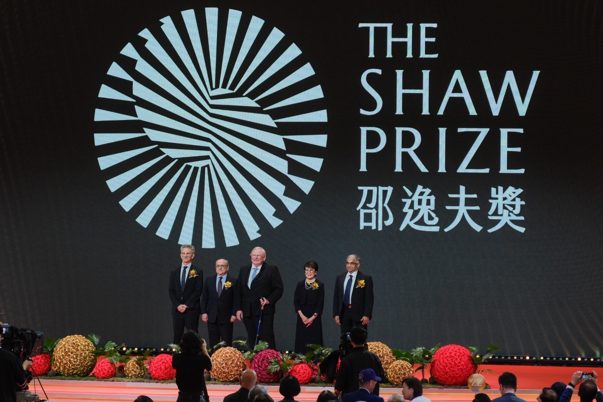 2024年度得獎者:天文學獎得獎主史里尼瓦斯・庫爾卡尼(右一)、生命科學與醫學獎得獎主鄧瑞麗(右二)和斯圖爾特・奧金(左二),以及數學科學獎得獎主彼得・薩納克(左一),由邵逸夫獎評審會主席萊因哈德·根舍(中)頒獎