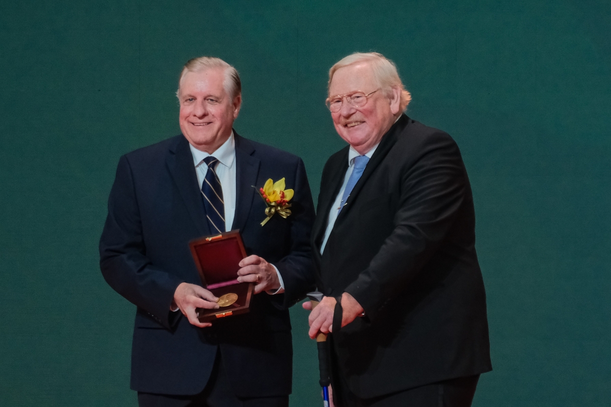 2021年度邵逸夫生命科學與醫學獎得獎者斯科特·埃姆爾(左)出席頒獎典禮,並獲頒獎章