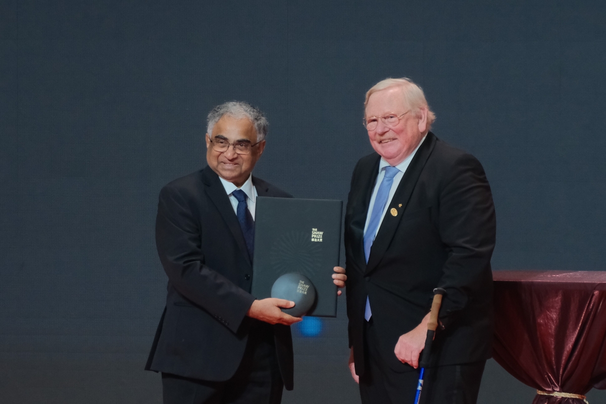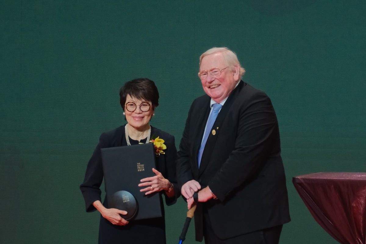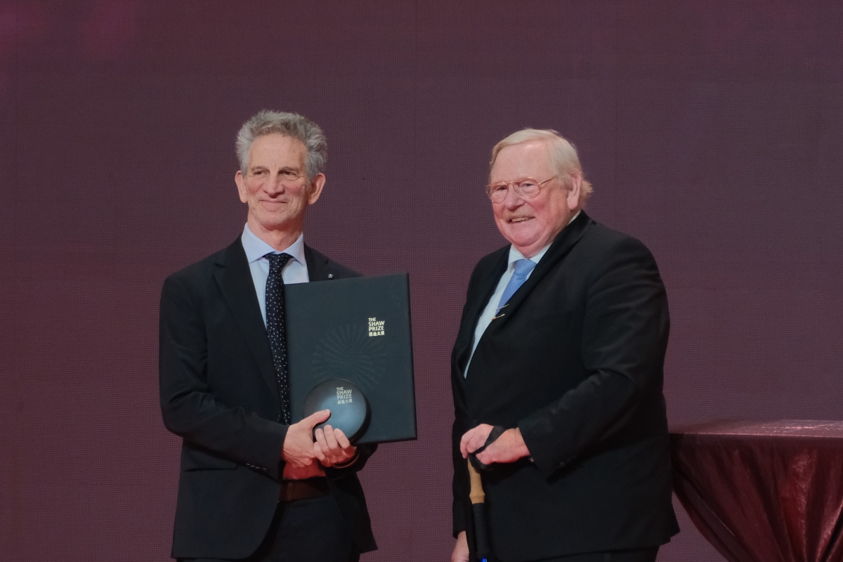 今年一共有五名科學家來港接受獎項,包括四位2024年度邵逸夫獎得獎者以及一位2021年度得獎者。2024年度得獎者,包括天文學獎得獎主史里尼瓦斯・庫爾卡尼(右一)、生命科學與醫學獎得獎主鄧瑞麗(右二)和斯圖爾特・奧金(左二),以及數學科學獎得獎主彼得・薩納克(左一),由邵逸夫獎評審會主席萊因哈德·根舍(中)頒獎