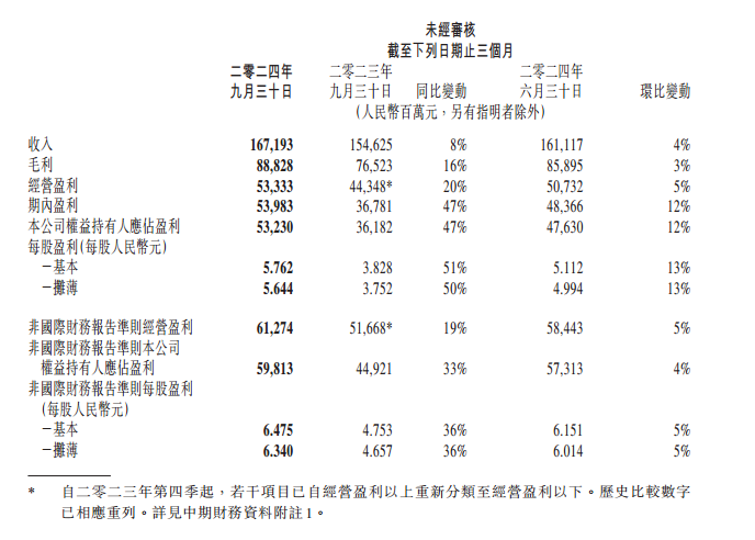 香港新聞網11月13日電 騰訊11月13日晚間發佈2024年第三季度財報。 財報顯示,騰訊第三季度營收1671.9億元(人民幣,下同),市場預估1679.3億元,同比增長8%;第三季度淨利潤532.3億元,市場預估453.3億元,同比增長47%。 據數據寶公眾號綜合數據,騰訊第三季度毛利與經營利潤(Non-IFRS)分別為888.28億元和612.74億元,同比增長16%和19%,連續八季超越營收增速。其中,增值服務收入達826.95億元,同比增長9%。