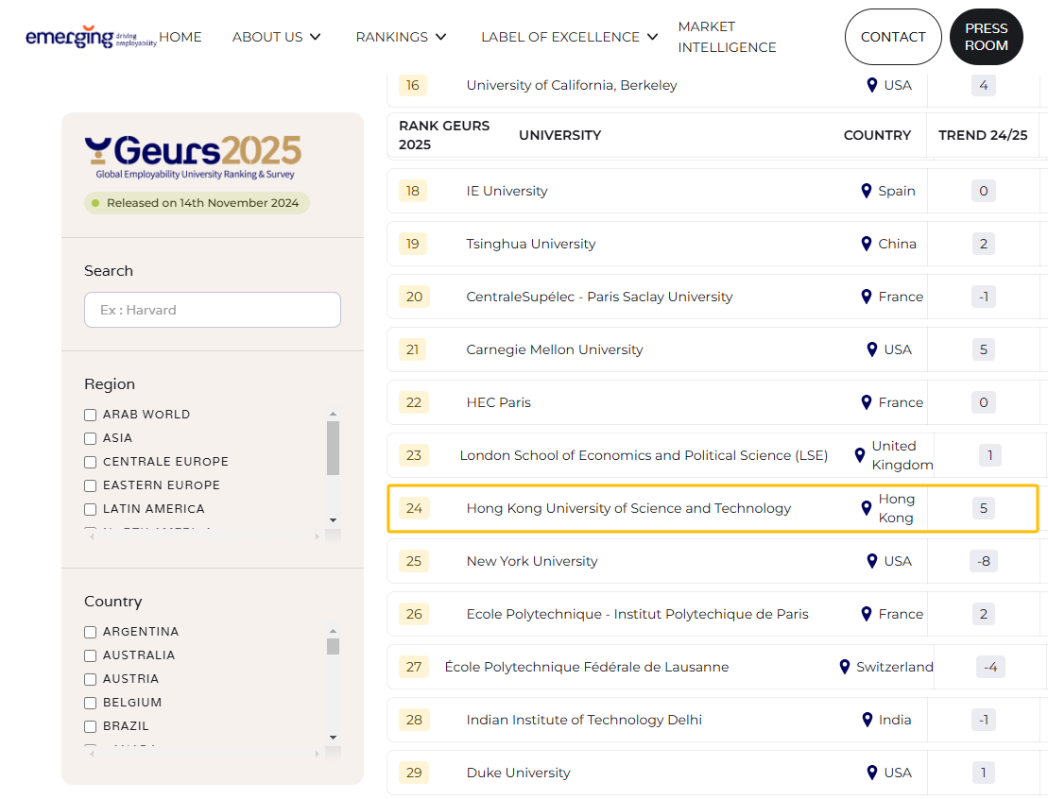 香港科技大學位列第24名。 香港科大表示,學校已連續12年躋身全球30強和全港之首,反映科大畢業生極具競爭力。排名可以作為評估大學表現的參考,科大將繼續努力,在教學產研各方面不斷求進,為社會作出貢獻。 位列榜單前5名的高校中,有4所來自美國,其中美國麻省理工學院位列全球第一。其餘高校按排名順序依次為美國加州理工學院、史丹佛大學、哈佛大學,以及英國劍橋大學。中國內地的北京大學及清華大學亦有上榜,分別位列第11名與第19名。 該榜單自2010年起發佈,今年已發佈第14次。據報道,是次調查共匯聚來自33個國家約1.3萬名僱主參與,每名受訪僱主可從全球逾1000所高校中選出最多10所,並進行投票。調查共收到近13萬票,是迄今樣本數最多的一次。(完) 【編輯:譚暢】
