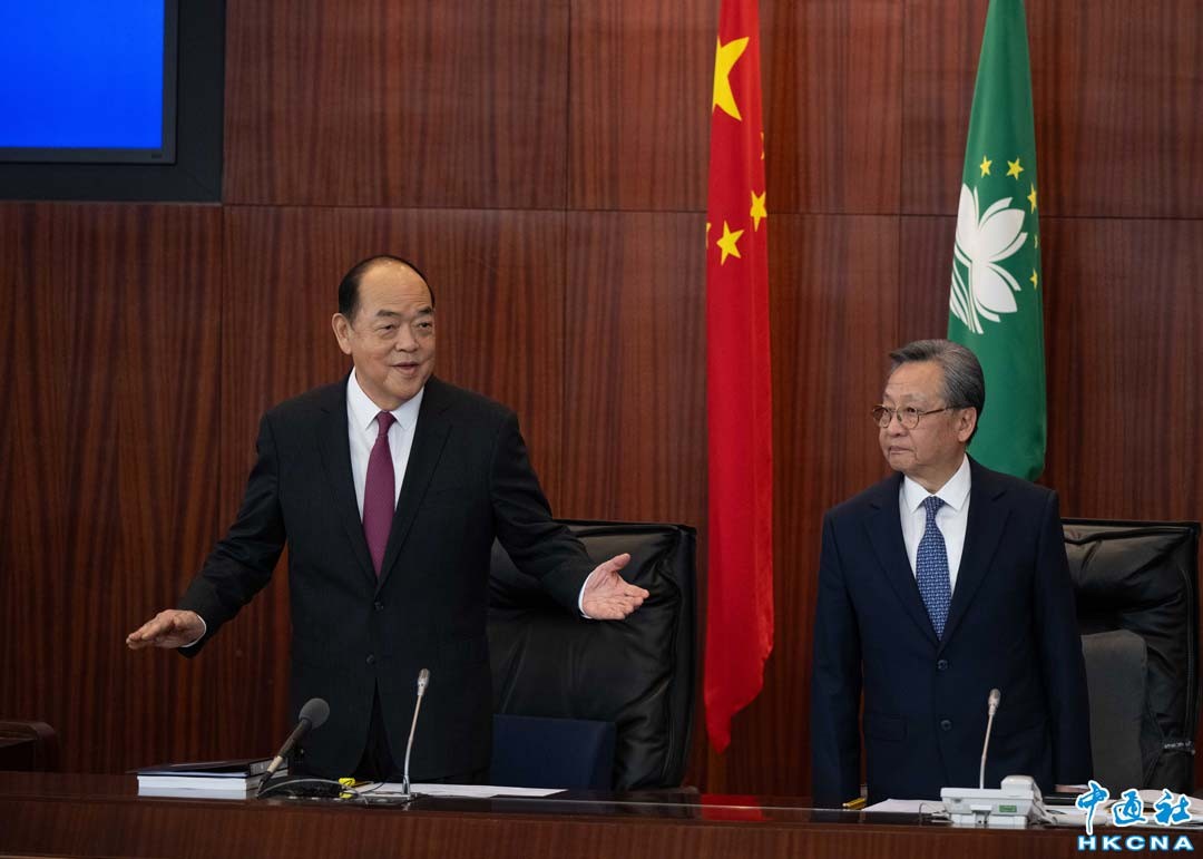 11月19日,澳門行政長官賀一誠(左)在立法會全體會議作2024年財政年度政府工作總結,並介紹2025年度的預算安排。 香港中通社圖片