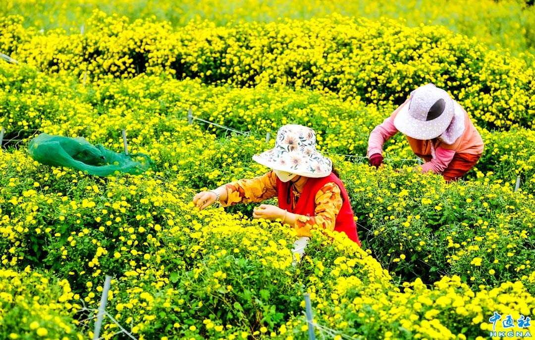 台灣苗栗銅鑼“杭菊”正值生產季節,田裏一片杭菊花海香氣幽雅迷人,色澤金黃,農民忙著採收,也吸引民眾前往觀賞拍照打卡。 香港中通社圖片