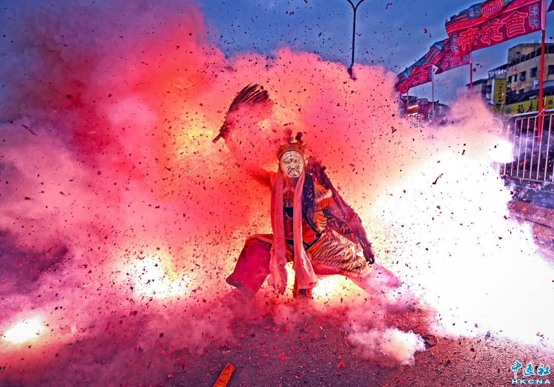 每年農曆10月23日為青山尊王壽誕,艋舺青山宮均循例舉行盛大的“青山王祭典”活動,是台北市重要祭典活動,俗稱“艋舺大拜拜”,每年青山王皆會率領官將出巡艋舺地區掃除惡煞並安定民心。“艋舺大拜拜”與大稻埕霞海城隍廟的“霞海城隍祭”,和大龍峒保安宮的“保生大帝祭”,同享“台北三大廟會”美譽。圖為11月22日台北艋舺青山宮舉行暗訪遶境活動。 香港中通社圖片