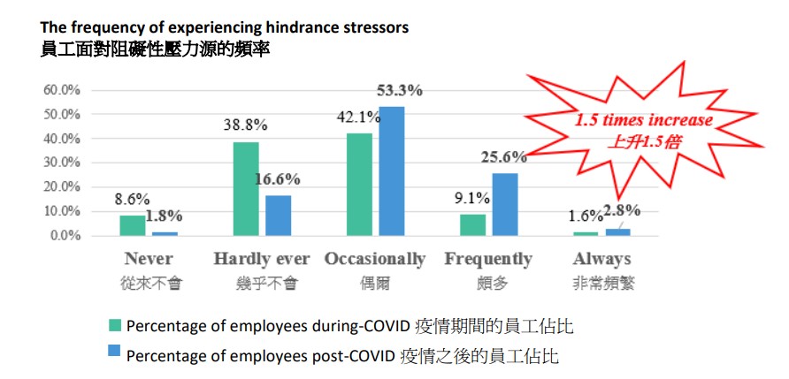 (數據來源:港大經管學院行為與決策科學研究所與香港優質顧客服務協會) 調查發現,疫後員工出現工作倦怠的比率較疫情前增加了1.7倍。研究團隊建議企業應推行創新措施以支援員工的心理健康,這不僅能減輕其壓力,還能提升顧客體驗並增強公司的競爭力。 研究數據顯示,在疫情期間,61%的員工同意或非常同意對工作感到滿意,但這一比例在疫情之後下降至57%,顯示出近7%的下降。此外,在疫情期間,約15.9%的員工經常或一直感到工作倦怠,而在疫情之後,這一比例大幅上升至43.6%。員工經常感到工作倦怠的主要原因是阻礙性壓力源,如硬性的約束與限制、分工模糊、顧客與公司間的需求衝突等,而非工作量的增加。這些壓力不但影響了員工的心理健康,還妨礙了他們提供高質素服務的能力。