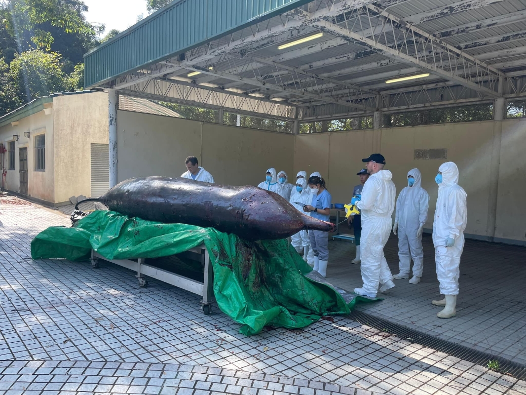 圖:漁護署 據了解,漁護署初步評估該鯨魚應該屬喙鯨科,品種待確認,體長約6至7米,性別為雄性。一般而言,喙鯨居於深水海域,很少進入淺水水域或遊近岸邊,香港水域並不是喙鯨的正常生境。由於解剖分析仍然進行中,鯨魚的品種詳細資料將稍後公佈。