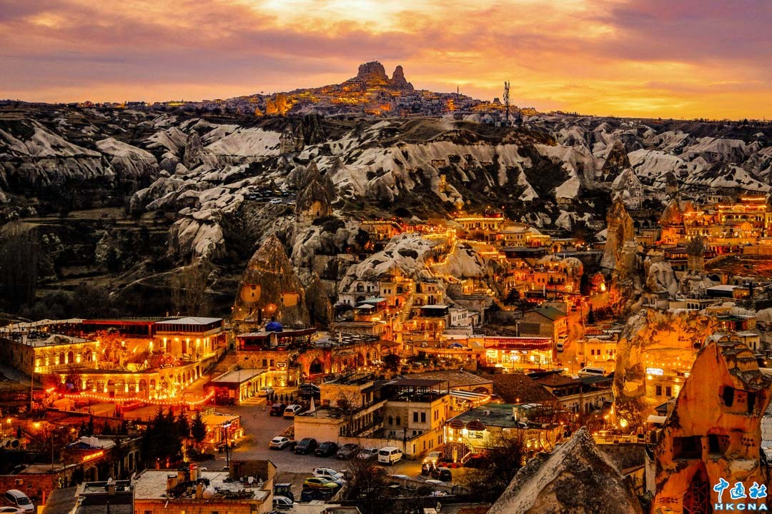 格雷梅是土耳其中部卡帕多奇亞地區的一個古老的城鎮,大約有2500人口。小鎮以羅馬城堡建築群為中心區域,四周被天然的火山岩和精靈煙囪岩環繞。每當夜幕降臨,小鎮的燈光亮起,彷彿置身於童話之中。 (香港中通社記者 許其皓攝)