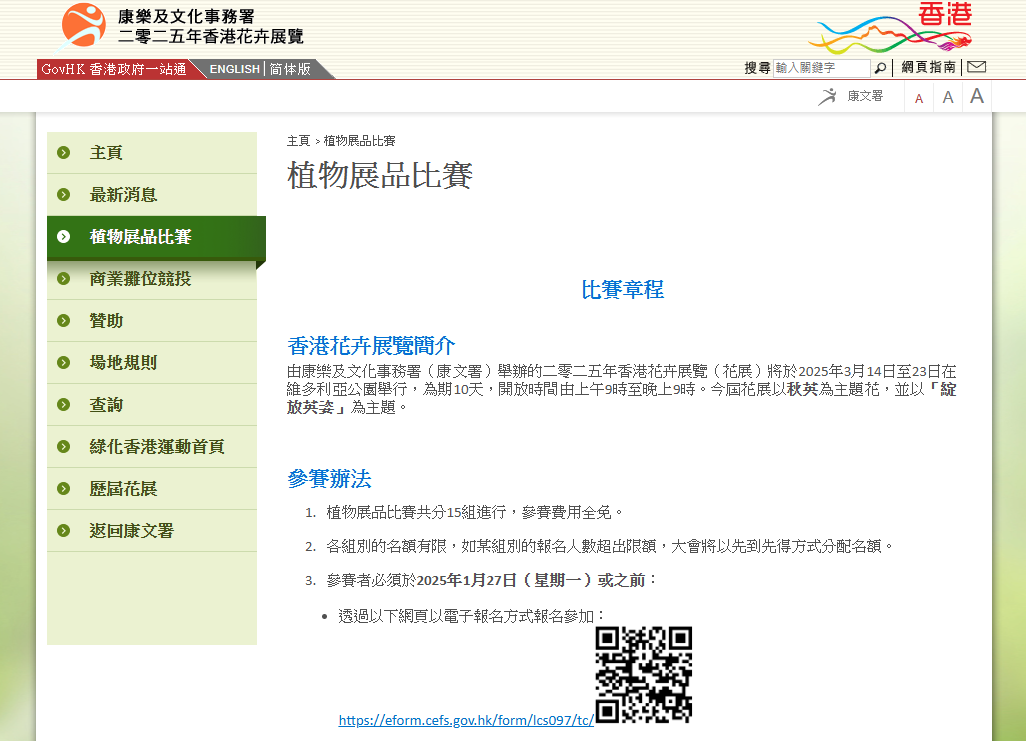 比賽分13組進行,包括蘭花、中國蘭蕙、盆花、仙人掌及肉質植物、賞葉及食蟲植物、非洲紫羅蘭、盆栽(盆景類植物)、西方插花藝術、東方插花藝術、學童插花藝術、小學組和中學組盆栽種植/培植比賽及學校園圃比賽。 參賽者須於1月27日或之前透過花展網頁www.lcsd.gov.hk/tc/hkfs/2025/exhibits.html 報名參加,或於花展網頁下載報名表,並將填妥的報名表送交或郵寄“2025年香港花卉展覽委員會秘書處”(沙田排頭街一至三號康樂及文化事務署總部十一樓),或傳真至2691 7264。查詢比賽詳情,請致電2601 8260或瀏覽花展網頁。 花展由康樂及文化事務署主辦,香港賽馬會慈善信託基金已連續13年支持花展,並於2014年起成為花展的主要贊助機構。(完) 【編輯:譚暢】
