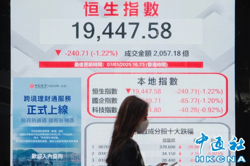 1月7日,截至收盤,香港恒生指數跌240.71點,跌幅1.22%,報19447.58點,主板全天成交2057.18億港元。香港中通社圖片 當天,恒指低開186點,報19501點,跌幅曾收窄至19點,高見19668點,之後沽壓加劇,最多跌435點,低見19252點,其後A股走強,港股跌幅收窄。 國企指數報7049點,跌85點;恆生科技指數報4354點,跌40點。 小米跌5.9%;阿里巴巴跌0.9%;美團跌1.3%;友邦跌1.1%;港交所跌0.5%。騰訊跌7.3%,是表現最差藍籌。中芯國際升5%,為表現最好藍籌。 體育用品股逆市升。安踏升1.9%;李寧升2.9%;滔搏升6.2%;特步升0.6%。 香港股票分析師協會副主席郭思治對中通社記者分析,受美國國防部宣佈將騰訊及多隻中資科技股列入與中國軍隊協作公司名單中,騰訊股價受壓,影響所及,恒指創月內新低,本月大市形態初呈先高後低,走勢轉弱。 郭思治表示,從技術上看,恒指正進一步跌穿100天線(約19441點),一旦跌穿,較關鍵支持將退守至去年11月26日低位19054點,可能漸漸發展成中期跌浪,對短期後市帶來一定壓力。(完) 【編輯:林曉惠】