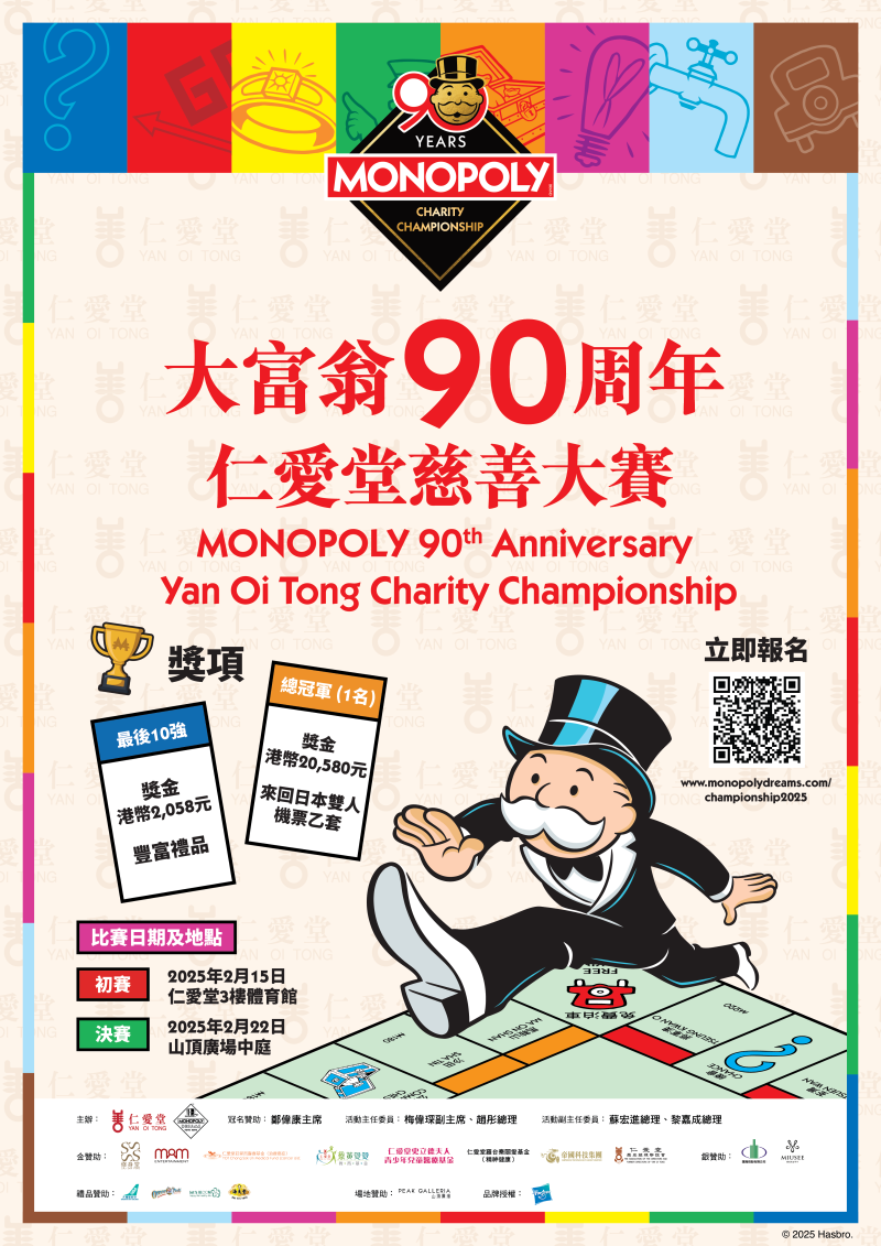 香港新聞網1月20日電 2025年是世界知名的經典桌遊“大富翁”發行90周年,仁愛堂將與大富翁夢想世界TM合辦大富翁90周年仁愛堂慈善大賽,作為香港區官方慶祝活動。活動同時為仁愛堂各項福利服務籌募善款,回饋社會。比賽將於2025年2月15日及22日舉行,參賽名額1000個,歡迎全港的大富翁愛好者一較高下,競逐冠軍寶座!