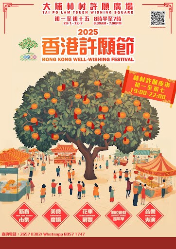 著名香港外籍演員喬寶寶與布偉傑近日參與拍攝香港許願節宣傳片,以搞笑和生動的方式將香港許願節的文化魅力推向國際,充分帶出香港許願節結合傳統與持續多元創新的理念,藉此吸引更多本地市民與外國遊客共襄盛舉。 此外,香港許願節有多項表演供市民免費觀賞,一同以勁歌熱舞迎接新年新氣象。年初二(1月30日)及年初三(1月31日)連續兩天下午3時為大家呈獻新春國際匯演,以世界各地文化作主題,帶來精彩舞蹈表演,展現香港多元文化匯萃的精髓。至於年初四(2月1日)下午3時更有《中年好聲音》的羅啟豪、丁文俊、林鉫徫、魏嘉信四位歌手齊集林村,以歌聲與市民歡度新春。 為了讓市民更快捷及方便到訪林村,今年許願節將會實施特別交通安排, 九巴將安排特別專線63R,途經港鐵大埔墟站、大埔超級城、港鐵太和站,其後特快直達許願廣場,車程約10分鐘。 香港許願節2025暨林村許願夜市 地點:大埔林村許願廣場 開放日期及時間: 1月29日至2月4日(年初一至年初七)上午8:30至晚上10:00 2月5日至12日(年初八至年十五)上午8:30至晚上7:00 交通指南 九巴 64K:港鐵大埔墟或太和站上車,於放馬莆站下車。 63R:在許願節開放期間,九巴特別專線將來往港鐵大埔墟站及林村許願廣場,途經大埔超級城 及港鐵太和站。 小巴 25K:港鐵太和站上車,於林村許願樹下車。 自駕人士 鄰近林村許願廣場之社山停車場為公眾停車場,駕駛人士可停泊於此。(完) 【編輯:黃璇】