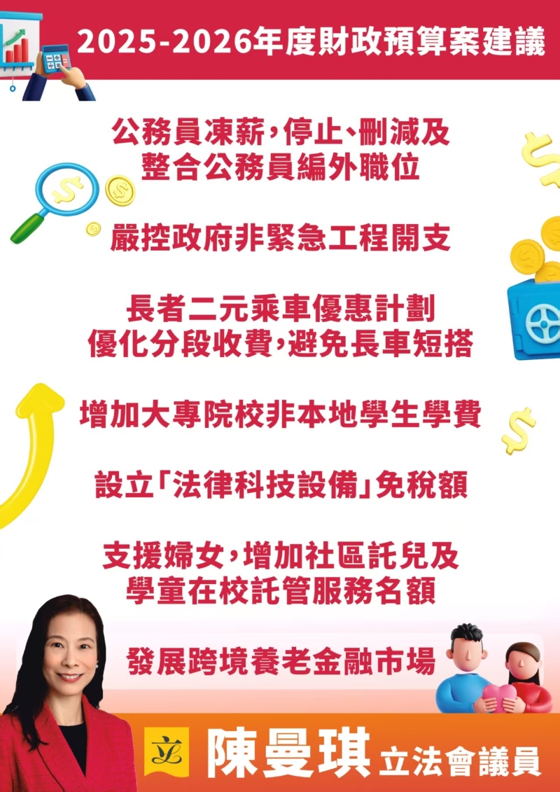 香港立法會議員陳曼琪就財政預算案提21項建議分享到: