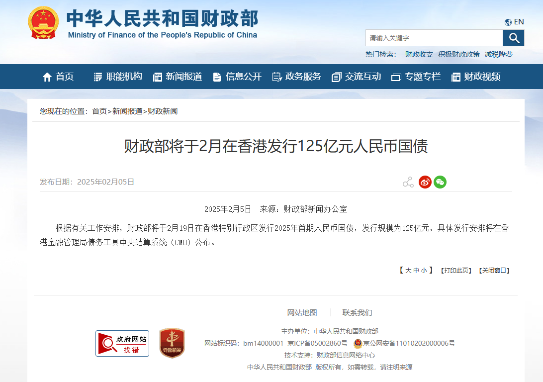 香港新聞網2月5日電 中國財政部5日公布,根據有關工作安排,將於2月19日在香港特別行政區發行2025年首期人民幣國債,發行規模為125億元人民幣,具體發行安排將在香港金融管理局債務工具中央結算系統(CMU)公布。(完)
