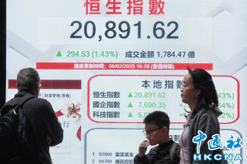香港中通社2月6日電(記者 譚暢)恒指6日升294點或1.4%,報20891點。大市全日成交約1784.5億港元。