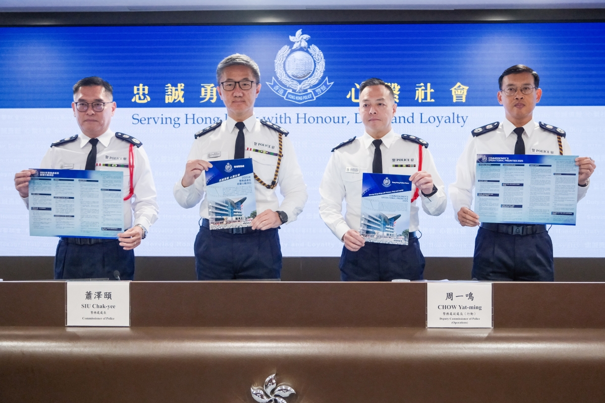 警務處處長蕭澤頤(左二)、警務處副處長(行動)周一鳴、副處長(國家安全)簡啟恩及副處長(管理)陳俊燊出席記者會