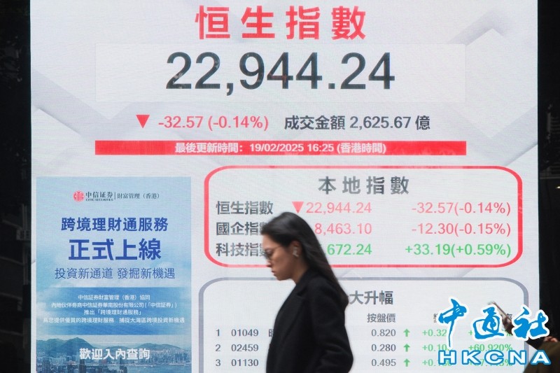 香港中通社2月19日電(記者 徐嘉儀)美股假期後復市造好,A股走高,港股19日急跌逾300點後回順。恆生指數收市報22944點,跌32點,大市成交額2625億港元。