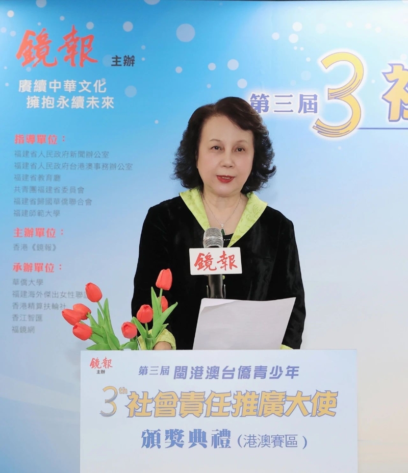 香港新聞網2月20日電  由《鏡報》主辦,華僑大學、福建海外傑出女性聯誼會、香港精算扶輪社、香江智滙和福鏡網承辦的第三屆“閩港澳台僑青少年社會責任推廣大使”評選活動以“賡續中華文化,擁抱永續未來”為宗旨,圍繞“我眼中的非物質文化遺產”為主題,舉辦了徵文及視頻作品比賽,吸引了眾多青少年參與,並於2月19日在香港銅鑼灣皇室堡舉行港澳賽區頒獎典禮。