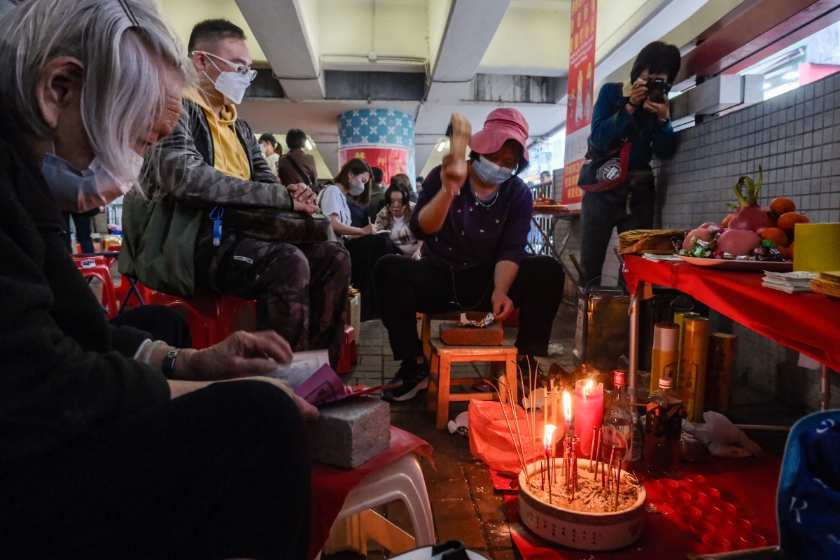 鵝頸橋下聚集了不少街坊市民前來“打小人”,借以驅除厄運趕走“小人”祈求平安。
