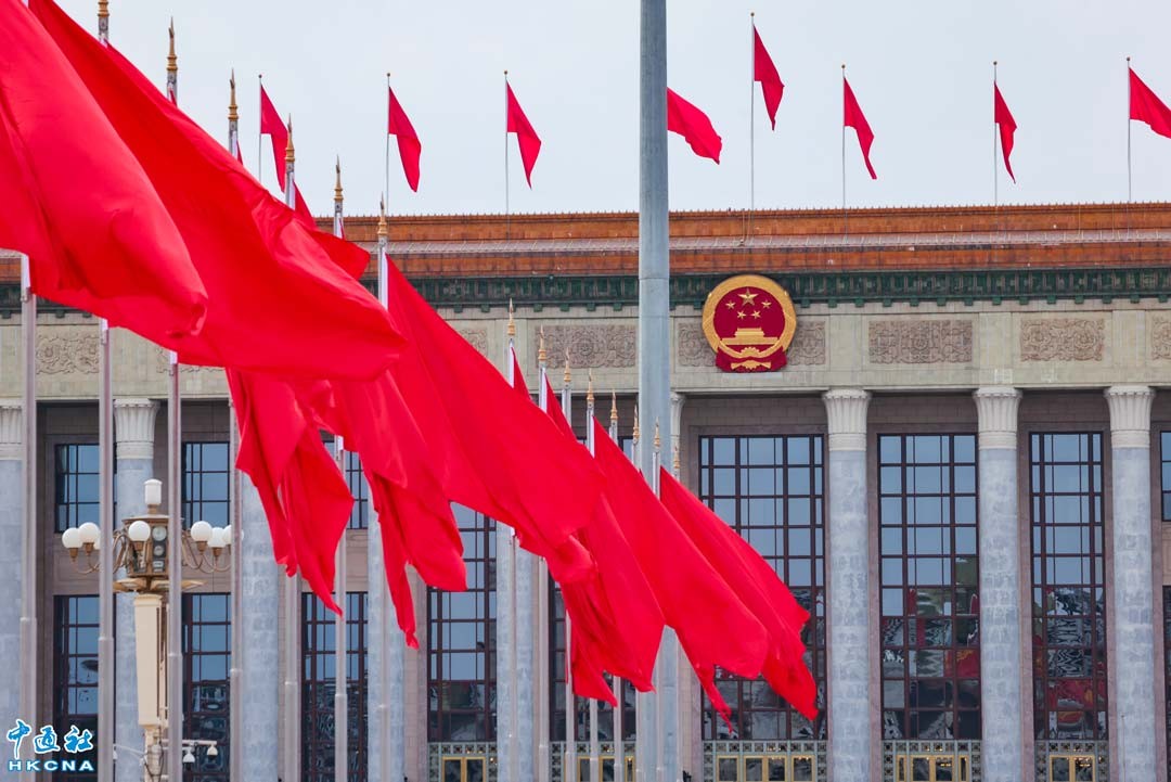 3月3日,北京天安門廣場、人民大會堂紅旗迎風飄揚。十四屆全國人大三次會議和全國政協十四屆三次會議將分別於3月5日和3月4日在北京開幕。(香港中通社記者 謝光磊攝)