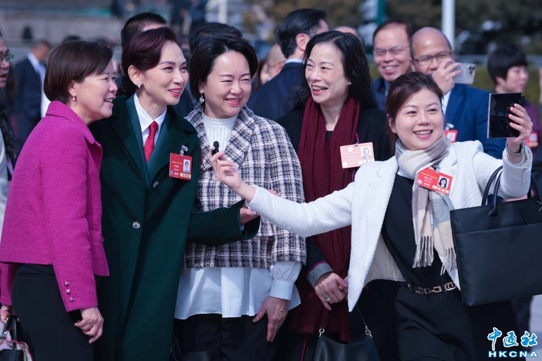 3月8日是“三八”國際勞動婦女節,恰逢“兩會時間”。兩會現場,來自不同崗位的女性代表委員和工作人員履職盡責,盡展巾幗風采。圖為3月4日,港區全國人大代表在參加會議後自拍。(香港中通社記者 謝光磊攝)