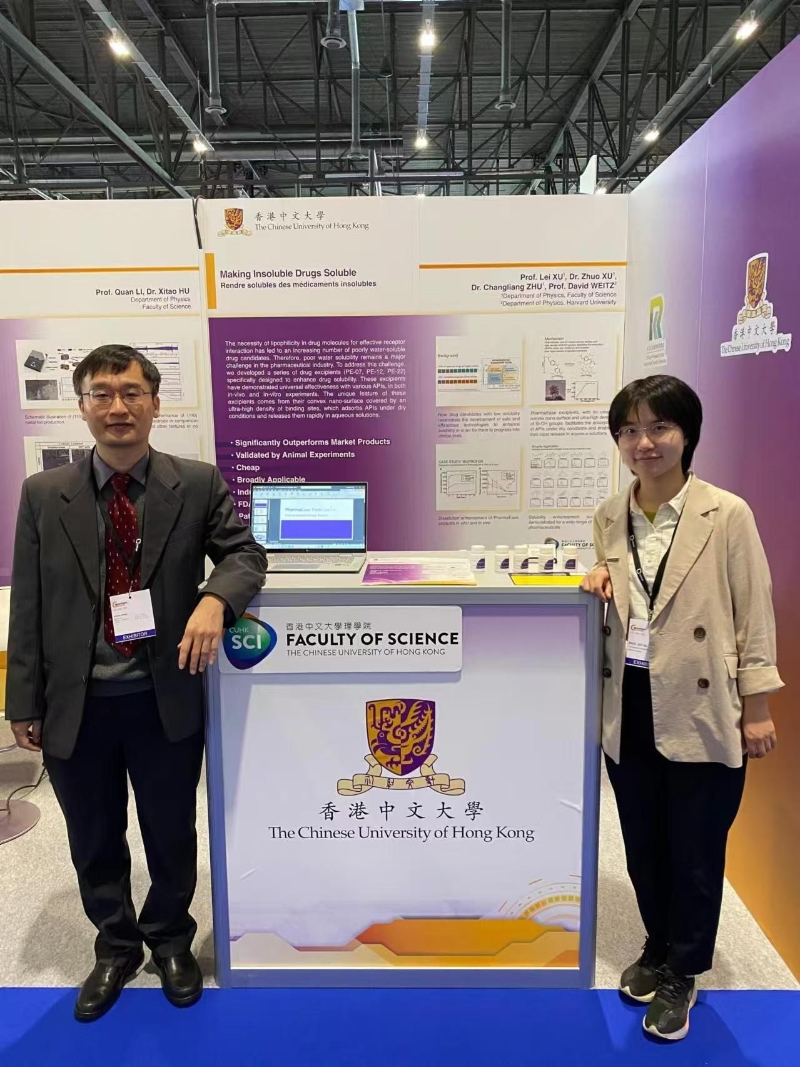 徐磊教授(左)領導的研究團隊憑此發明在2024年第49屆“日內瓦國際發明展”勇奪銀獎。圖源:香港中文大學 低溶解度會減低藥物的生體可用率及治療效果,影響其臨床療效。不少候選藥物易於在人體的脂肪中溶解並吸附於人體的細胞膜中,惟水中溶解的表現遜色,使它們難以通過臨床測試並商品化。因此,尋找有效的方法來增加溶解度對於開發新藥和提高現有藥物療效至關重要。 有見及此,徐教授領導的研究團隊研發了創新藥物製劑技術,透過特殊設計的二氧化矽表面,提高其對藥物和水分子的親和力。在乾燥的環境中,二氧化矽表面能有效吸附藥物分子;當接觸水時,二氧化矽表面則會與水分子結合,並將藥物分子置換(改變其元素排序),顯著增加藥物溶解度。此技術適用於多種藥物,穩定性高,使藥物能長期儲存,亦合乎成本效益及能夠大規模生產,有望成為下一代藥物製劑和遞送的平台技術。 徐教授說:“我們的製劑方法是用二氧化矽等低成本和生物相容性材料製成,可應用於多種藥物,作用顯著。製作過程依靠溫度和壓力調整等常用技術,操作簡單,並能大規模生產,更合乎成本效益。” 研究團隊已成功將此新方法應用於多種難溶藥物,包括非諾貝特、雷帕黴素、雙氯芬酸、辛伐他汀、奧沙普嗪、瑞格列奈、氟比洛芬、紫杉醇、多西他賽和布洛芬,反映技術能應用於心血管疾病至腫瘤學的不同治療領域。研究團隊憑此發明在2024年第49屆“日內瓦國際發明展”勇奪銀獎,並成立初創企業PharmaEase Tech Limited,旨在與行業夥伴合作,將新製劑方法應用於更多候選新藥。 (完) 【編輯:梁嘉軒】