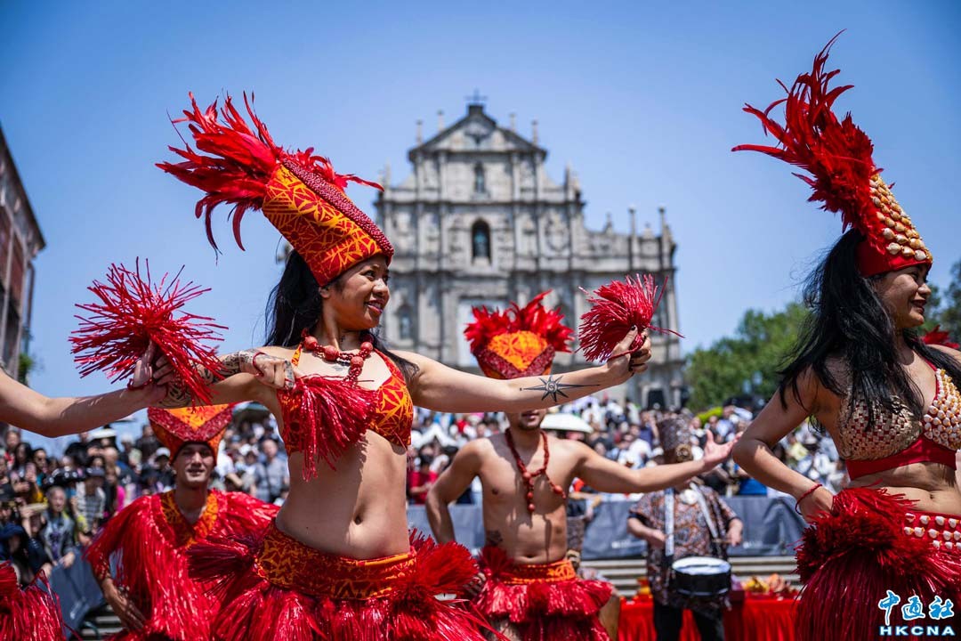 3月21日,儀式前的暖場演出。當日,慶祝澳門回歸祖國二十六周年“2025澳門國際幻彩大巡遊”拜神儀式在大三巴牌坊耶穌會紀念廣場舉行,儀式前設有暖場演出。 香港中通社圖片